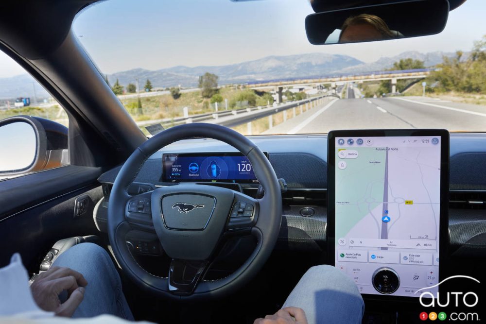 Le système de conduite semi-autonome BlueCruise fonctionne avec un système de surveillance du conducteur basé sur le travail de caméras pour déterminer le niveau d’attention de celui qui est aux commandes du véhicule. Il peut être utilisé sur 97 % des autoroutes américaines et canadiennes sans intersections ni feux de signalisation.